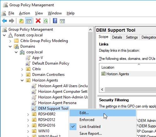 - Right-click the Horizon Agent Computer Settings GPO and click Edit.