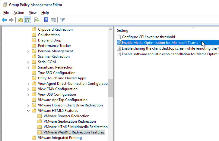 - Go to Computer Configuration | Policies | Administrative Templates | Omnissa Horizon Agent Configuration | VMware HTML5 Features | Horizon WebRTC Redirection Features.