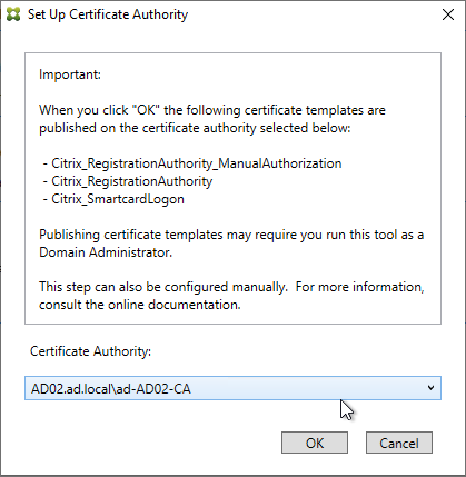 8. Select a CA that will issue this FAS server a Registration Authority certificate. Later, you will need to open the Certificate Authority console on the chosen server. Click OK.