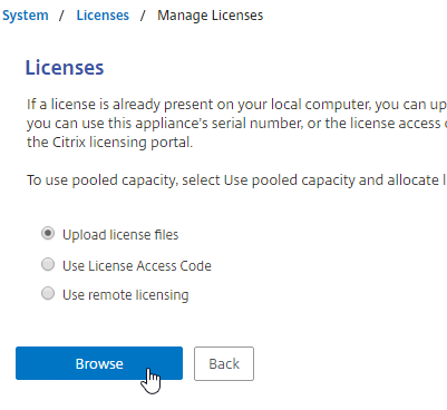 4. If you have a license file, select Upload license files, and then click Browse. Select the license file, and click Open.